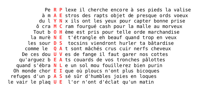 Ce poème est une contribution à L’Oulipien de l’année, rubrique du site Zazie mode d’emploi dans laquelle chaque année, en l’honneur d’un membre de l’Oulipo, un texte de lui est proposé à toutes les réécritures. C’est cette année Raymond Queneau dont un des Cent mille milliards de poèmes est donné. Inspiré par une intense activité de la liste Oulipo sur ces acrostiches internes (l’expression en acrostiche n’étant pas forcément en début de vers) on tente ici d’aligner de tels acrostiches internes sur deux colonnes successives, tout en cherchant une forme évoquant le contenu du poème – ici une valise penchée.