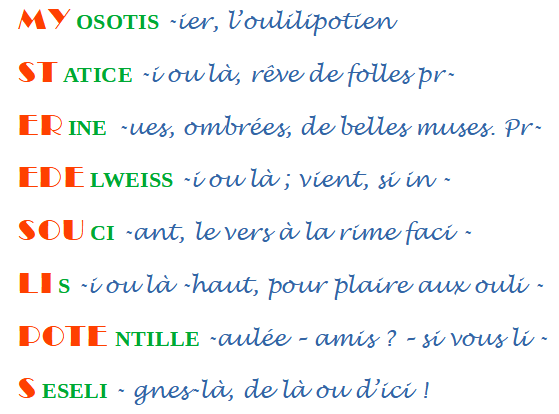 ( à la rime, escalettres : chaque mot contient les lettres du précédent plus une )