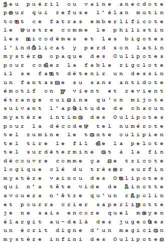 1er juin - St Mirador Un block dans la nuit. On dort à trois par châlit Par un froid glacial. Un bruit furtif. Qui court là ? On va zigzaguant, Glissant sous un lacs tranchant : Loin là-bas un bois. Au mirador un fusil. Impact. Sursaut. Nuit. ( lipogramme - deux mètres premiers, et tout nombre impair de vers consécutifs compte ( sauf erreur ! ) un nombre premier de syllabes ) Respectant d'architog les lois sur les syllabes Qu'impose Esposito, roi des chiffres arabes, À ce diam ce n'est que ce qu'au rôt le hot-dog : Le nombre de ses vers est nombre non premier ! J'aurais dû remiser mon encre et mon plumier. Ce drôle de machin n'est qu'infra-archi-tog.